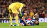 Penjaga gawang Porto Diogo Costa menjaga rekan setimnya Alan Valera yang mengalami cedera saat pertandingan leg kedua babak 16 besar Liga Champions UEFA antara Arsenal dan Porto di London, Inggris, Rabu (13/3/2024) dini hari WIB. (FOTO : EPA-EFE/NEIL HALL)