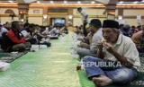 Warga melaksanakan buka puasa bersama di Masjid Agung Al Azhar, Jakarta, Rabu (13/3/2024). Masjid Agung Al Azhar menyediakan 700 paket makanan berupa takjil dan makanan berat setiap harinya untuk umat Muslim yang ingin berbuka puasa di masjid tersebut selama bulan suci Ramadhan 1445 Hijriah. (FOTO : Republika/Putra M. Akbar)
