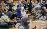 Warga menunggu waktu buka puasa bersama di Masjid Agung Al Azhar, Jakarta, Rabu (13/3/2024). Masjid Agung Al Azhar menyediakan 700 paket makanan berupa takjil dan makanan berat setiap harinya untuk umat Muslim yang ingin berbuka puasa di masjid tersebut selama bulan suci Ramadhan 1445 Hijriah. (FOTO : Republika/Putra M. Akbar)