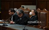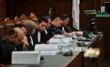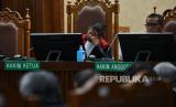 Ketua Majelis Hakim menyimak pembacaan tuntutan terdakwa Sekretaris Mahkamah Agung (MA) nonaktif Hasbi Hasan saat menjalani sidang di Pengadilan Negeri Tipikor, Jakarta Pusat, Kamis (14/3/2024). Jaksa penuntut umum (JPU) Komisi Pemberantasan Korupsi (KPK) menuntut terdakwa Hasbi Hasan dipidana selam 13 tahun dan 8 bulan penjara, denda Rp 1 miliar subsider 6 bulan kurungan, serta membayar uang pengganti sebesar Rp3,88 miliar subsider 3 tahun kurungan. Dalam perkara tersebut, Hasbi Hasan dinilai terbukti secara sah dan meyakinkan hukum telah menerima suap penanganan perkara kasasi Koperasi Simpan Pinjam (KSP) Intidana yang bergulir di MA. (FOTO : Republika/Thoudy Badai)