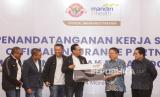 Ketua Umum PSSI Erick Thohir (kedua kanan) bersama Direktur Utama Mandiri Inhealth Budi Tampubolon (kedua kiri), Direktur Garuda Sepak Bola Indonesia Marsal Irwan Masita (tengah), Wakil Komisaris Utama Bank Mandiri Zainudin Amali (kiri) dan Direktur Pemasaran Mandiri Inhealth Bugi Riagandhy (kanan) saat penandatanganan kerja sama di Jakarta, Kamis (14/3/2024) .PSSI bekerja sama dengan Mandiri Inhealth menghadirkan akses layanan asuransi kesehatan bagi pemain tim nasional sepak bola Indonesia sebagai upaya memajukan sepak bola tanah air dengan memberikan pertanggungan asuransi kesehatan untuk seluruh pemain Tim Nasional Sepak Bola Indonesia Senior, U-23, U 20/U-19, U-17/U-16 dan pemain timnas sepak bola Wanita senior dan junior, sepak bola Pantai dan E-Sport. (FOTO : Republika/Putra M. Akbar)