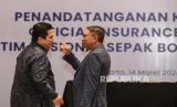Ketua Umum PSSI Erick Thohir dan Wakil Komisaris Utama Bank Mandiri Zainudin Amali (kanan) berbincang saat penandatanganan kerja sama antara PSSi dan Mandiri Inhealth di Jakarta, Kamis (14/3/2024). PSSI bekerja sama dengan Mandiri Inhealth menghadirkan akses layanan asuransi kesehatan bagi pemain tim nasional sepak bola Indonesia sebagai upaya memajukan sepak bola tanah air dengan memberikan pertanggungan asuransi kesehatan untuk seluruh pemain Tim Nasional Sepak Bola Indonesia Senior, U-23, U 20/U-19, U-17/U-16 dan pemain timnas sepak bola Wanita senior dan junior, sepak bola Pantai dan E-Sport. (FOTO : Republika/Putra M. Akbar)
