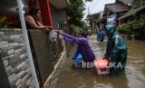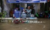 Warga membeli makanan dan minuman di depan rumahnya yang terendam banjir di kawasan Jalan Sawah Besar, Semarang, Jawa Tengah, Kamis (14/3/2024). Berdasarkan data Badan Penanggulangan Bencana Daerah (BPBD) Kota Semarang sebanyak 158.137 jiwa di 40 kelurahan terdampak luapan Banjir Kanal Timur (BKT) karena intensitas hujan tinggi pada Rabu (13/3) malam dengan ketinggian air dari 20 sentimeter hingga 80 sentimeter. (FOTO : ANTARA FOTO/Makna Zaezar)