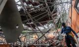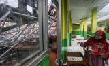 Guru melihat kondisi ruang kelas yang atapnya ambruk di SMAN 1 Ciampea, Kabupaten Bogor, Jawa Barat, Jumat (15/3/2024). Menurut data BPBD Kabupaten Bogor ambruknya atap bangunan SMAN 1 Ciampea dipicu hujan deras yang mengguyur wilayah tersebut pada Kamis (14/3), dan mengakibatkan tujuh orang siswa terluka. (FOTO : ANTARA FOTO/Yulius Satria Wijaya)