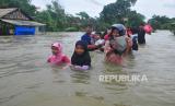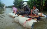 Sejumlah warga berjalan melintasi jalan yang terendam banjir di Desa Setrokalangan, Kudus, Jawa Tengah, Jumat (15/3/2024). Menurut data BPBD setempat per Jumat 15/3, banjir akibat intensitas hujan yang tinggi di wilayah pegunungan Muria serta meluapnya sungai Wulan itu selain menyebabkan ribuan rumah terendam dan sebanyak 22.994 Jiwa terdampak serta sebanyak 271 Jiwa mengungsi di 20 Desa dari lima Kecamatan, juga menyebabkan empat orang meninggal akibat tenggelam. (FOTO : ANTARA FOTO/Yusuf Nugroho)