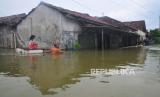 REPUBLIKA.CO.ID, KUDUS -- Warga melintasi jalan yang terendam banjir dengan perahu rakit di Desa Setrokalangan, Kudus, Jawa Tengah, Jumat (15/3/2024).