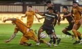 REPUBLIKA.CO.ID, JAKARTA. -- Tim sepak bola Dewa United melawan Bhayangkara FC pada laga lanjutan BRI Liga 1 di Stadion PTIK, Jakarta, Sabtu (16/3/2024).