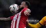 Pemain Atletico Madrid Memphis Depay mengontrol bola melewati pemain Barcelona saat pertandingan sepak bola La Liga di stadion Metropolitano di Madrid, Spanyol, Senin (18/3/2024). Barcelona menang telak dengan skor 3-0. Gol Barcelona dicetak Joao Felix menit ke-38, Robert Lewndowski menit ke-47 dan Fermin Lopez di menit ke-65. Pada pertandingan itu, pelatih Barcelona Xavi Hernandez harus meninggalkan lapangan setelah mendapat kartu merah dari wasit. (FOTO : AP Photo/Bernat Armangue)