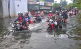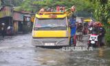 REPUBLIKA.CO.ID, KUDUS -- Sejumlah pengendara melintasi jalan yang tergenang banjir di Desa Tanjung Karang, Jati, Kudus, Jawa Tengah, Selasa (19/3/2024).