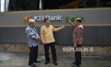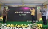 Komisaris Utama Independen KB Bank Syariah Mustafa Abubakar, Direktur Utama KB Bank Woo Yeul Lee, Direktur Utama KB Bank Syariah Koko Tjatur Rachmadi (dari kiri) saat peluncuran perubahan logo dan merek baru KB Bukopin Syariah menjadi KB Bank Syariah di Jakarta, Selasa (19/3/2024). Perubahan nama merek dan logo ini melengkapi perjalanan transformasi Perusahaan yang dimulai sejak tahun 2021, dimana sebelumnya nama merek Perusahaan yaitu Bank Syariah Bukopin menjadi KB Bukopin Syariah dan kini hadir dengan nama serta logo baru yaitu KB Bank Syariah. Perubahan nama baru ini semakin menegaskan kepada publik bahwa KB Bank Syariah merupakan bagian dari KB Bank dan KB Financial Group (KBFG) yang merupakan entitas keuangan terbesar asal Korea Selatan. (FOTO : Dok Republika)