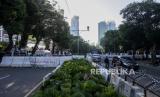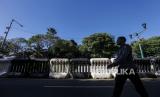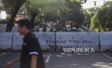 Warga berjalan di dekat pembatas jalan menuju Gedung KPU di Jalan Imam Bonjol, Jakarta, Selasa (19/3/2024). Jelang hasil akhir proses rekapitulasi nasional Pemilu 2024 akses menuju Gedung KPU ditutup untuk peningkatan keamanan. (FOTO : Republika/Putra M. Akbar)