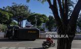 Mobil water canon berjaga di depan Gedung KPU di Jalan Imam Bonjol, Jakarta, Selasa (19/3/2024). Jelang hasil akhir proses rekapitulasi nasional Pemilu 2024 akses menuju Gedung KPU ditutup untuk peningkatan keamanan. (FOTO : Republika/Putra M. Akbar)
