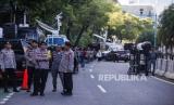 Polisi bersiaga di depan Gedung KPU di Jalan Imam Bonjol, Jakarta, Selasa (19/3/2024). Jelang hasil akhir proses rekapitulasi nasional Pemilu 2024 akses menuju Gedung KPU ditutup untuk peningkatan keamanan. (FOTO : Republika/Putra M. Akbar)