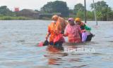 REPUBLIKA.CO.ID, KUDUS. -- Warga melintasi jalan yang terendam banjir di Karangturi, Setrokalangan, Kaliwungu, Kudus, Jawa Tengah, Selasa (19/3/2024).