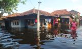 Warga berjalan di depan rumah yang terendam banjir di Karangturi, Setrokalangan, Kaliwungu, Kudus, Jawa Tengah, Selasa (19/3/2024). Badan Penanggulangan Bencana Daerah (BPBD) setempat mencatat hingga Selasa (19/3) banjir yang menerjang Kabupaten Kudus sejak Rabu (13/3) atau sepekan terakhir akibat hujan deras di wilayah hulu dan melimpasnya Sungai Wulan itu masih merendam 6.523 rumah di 31 desa dengan 39.272 jiwa terdampak dan tujuh diantaranya meninggal dunia serta sebanyak 2.711 jiwa mengungsi. (FOTO : ANTARA FOTO/Yusuf Nugroho)