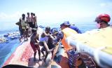 Personel Basarnas bersama TNI AL dan Polairud Polda Aceh mengevakuasi imigran etnis Rohingya yang terombang-ambing di perairan laut Meulaboh, Aceh Barat, Aceh, Kamis (21/3/2024). Sebanyak 69 pengungsi Rohingya yang terdiri 45 laki-laki dan 24 perempuan dievakuasi ke daratan setelah kapal yang mereka tumpangi terbalik sekitar 15 mil di perairan Samudra Hindia. (FOTO : AP Photo/Reza Saifullah)