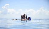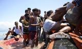 Puluhan Imigran etnis Rohingya berada diatas kapal yang karam di perairan laut Meulaboh, Aceh Barat, Aceh, Kamis (21/3/2024). Sebanyak 69 pengungsi Rohingya yang terdiri 45 laki-laki dan 24 perempuan dievakuasi ke daratan setelah terombang-ambing karena kapal yang mereka tumpangi terbalik sekitar 15 mil di perairan Samudra Hindia. (FOTO : AP Photo/Reza Saifullah)