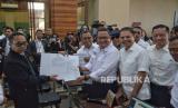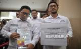 Ketua Tim Hukum Timnas AMIN Ari Yusuf Amir didampingi Kapten Timnas AMIN Muhammad Syaugi dan Co-Captain Timnas AMIN Thomas Lembong menerima tanda terima saat mengajukan permohonan perselisihan hasil pemilihan umum (PHPU) Pilpres 2024 di Mahkamah Konstitusi (MK), Jakarta, Kamis (21/3/2024). Pasangan Calon Presiden dan Wakil Presiden nomor urut 1 Anies Baswedan dan Muhaimin Iskandar resmi menggugat hasil Pilpres 2024 yang baru saja ditetapkan KPU ke Mahkamah Konstitusi (MK). Timnas yakin bahwa bukti-bukti dan saksi yang ada sudah lengkap dan matang. (FOTO : Republika/Prayogi)