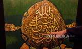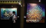 Salah satu lukisan kaligrafi yang dipamerkan di Aula Buya Hamka, Kompleks Masjid Agung Al-Azhar, Jakarta, Kamis (21/3/2024). Pameran bertajuk Kemanusiaan Tanpa Batas yang menampilkan berbagai lukisan karya 40 seniman tersebut berlangsung hingga 26 Maret 2024. Selain dipamerkan, karya lukisan tersebut juga dilelang yang hasil penjualannya akan didonasikan untuk membantu rakyat Palestina. (FOTO : Republika/Putra M. Akbar)