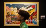 Pengunjung melihat pameran lukisan di Aula Buya Hamka, Kompleks Masjid Agung Al-Azhar, Jakarta, Kamis (21/3/2024). Pameran bertajuk Kemanusiaan Tanpa Batas yang menampilkan berbagai lukisan karya 40 seniman tersebut berlangsung hingga 26 Maret 2024. Selain dipamerkan, karya lukisan tersebut juga dilelang yang hasil penjualannya akan didonasikan untuk membantu rakyat Palestina. (FOTO : Republika/Putra M. Akbar)