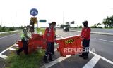 REPUBLIKA.CO.ID, TEGAL. -- Petugas mengangkat water barier saat persiapan arus mudik di jalan tol Pejagan-Pemalang, Tegal, Jawa Tengah, Kamis (21/3/2024).