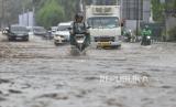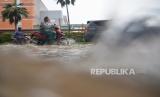 Kendaraan menerobos genangan air yang merendam di Jalan Boulevard Raya, Kelapa Gading, Jumat (22/3/2024). Badan Penanggulangan Bencana Daerah (BPBD) Jakarta mengumumkan, terjadi banjir di sebelas ruas jalan Jakarta. Hujan yang mengguyur wilayah Jakarta semalam juga mengakibatkan di Jalan Boulevard Raya tersebut terendam dengan ketinggian 20 cm. (FOTO : Republika/Prayogi)