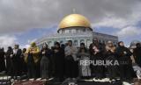 Umat Islam sholat di bawah Masjid Kubah Batu di kompleks Masjid Al-Aqsa untuk salat Jumat kedua di bulan suci Ramadhan di Kota Tua Yerusalem, Jumat, (22/3/2024). (FOTO : AP Photo/Mahmoud Illean)