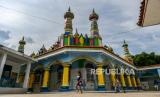 Anak-anak bermain di area Masjid Hidayatunnas di Desa Sirnagalih, Kecamatan Cisurupan, Kabupaten Garut, Jawa Barat, Ahad (24/3/2024). Masjid Hidayatunnas yang dibangun sejak 20 tahun lalu tersebut memiliki corak warna-warni di bagian dalam maupun luar masjid yang menjadi keunikan dan ciri khasnya. (FOTO : ANTARA FOTO/Raisan Al Farisi)