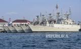 KRI jenis Parchim class berada di dermaga saat pelaksanaan inspeksi kapal perang (Admiral Inspection) dan Exit Broadcasting Pangkoarmada I Laksamana Muda TNI Achmad Wibisono dan Danseskoal Laksamana Muda TNI Yoos Suryono Hadi di Kompleks Satuan Kapal Koarmada I Pondok Dayung, Jakarta, Ahad (24/3/2024). Admiral Inspection dan Exit Broadcasting tersebut dilaksanakan dalam rangka jelang serah terima jabatan dari Pangkoarmada I Laksamana Muda TNI Achmad Wibisono ke Danseskoal Laksamana Muda TNI Yoos Suryono Hadi. (FOTO : ANTARA FOTO/Muhammad Adimaja)