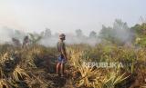 REPUBLIKA.CO.ID, DUMAI -- Seorang petani memerhatikan semak belukar yang terbakar dekat kebun miliknya di Kecamatan Dumai Timur, Dumai, Riau, Ahad (24/3/2024).