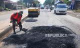 REPUBLIKA.CO.ID, DEMAK. -- Pekerja mengukur ketebalan aspal jalan yang rusak akibat banjir saat perbaikan di jalan pantura, Karanganyar, Demak, Jawa Tengah, Senin (25/3/24).