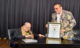 Pendiri Lingkaran Survei Indonesia (LSI) Denny JA menerima penghargaan dari pendiri Museum Rekor Dunia-Indonesia (MURI) Jaya Suprana atas prestasinya yang telah lima kali memenangkan Pemilihan Presiden Indonesia di Jaya Suprana Institute (JSI), Jakarta Senin (25/3/2024). (FOTO : Dok. Republika)