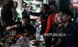 Warga menikmati makanan yang dibagikan gratis untuk berbuka puasa di kawasan Stasiun Bogor, Kota Bogor, Jawa Barat, Senin (25/3/2024). Lembaga kemanusiaan SalamAid menggelar program Warung Seribu Cinta spesial Ramadhan dengan membagikan sebanyak ratusan porsi makanan yang disajikan bagi para pekerja maupun masyarakat yang masih berada di jalanan saat waktu berbuka puasa. Berbagai hidangan mulai dari takjil, minuman hingga nasi beserta lauk pauknya dihidangkan secara gratis. (FOTO : Republika/Putra M. Akbar)