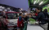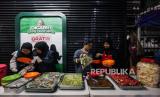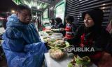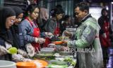 Warga memilih menu berbuka puasa yang dibagikan gratis di kawasan Stasiun Bogor, Kota Bogor, Jawa Barat, Senin (25/3/2024). Lembaga kemanusiaan SalamAid menggelar program Warung Seribu Cinta spesial Ramadhan dengan membagikan sebanyak ratusan porsi makanan yang disajikan bagi para pekerja maupun masyarakat yang masih berada di jalanan saat waktu berbuka puasa. Berbagai hidangan mulai dari takjil, minuman hingga nasi beserta lauk pauknya dihidangkan secara gratis (FOTO : Republika/Putra M. Akbar)