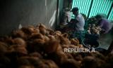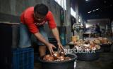 Pekerja menyelesaikan proses pembuatan dodol betawi di Pondok Dodol Sari Rasa Ibu Yuyun di Jalan Damai Baru, Pasar Minggu, Jakarta Selatan, Selasa (26/3/2024). Pada bulan suci ramadhan, produksi dodol Betawi meningkat dari semula 2 wajan adonan per hari, kini mampu 16 wajan adonan per hari seiring dengan banyaknya jumlah permintaan untuk hari raya Idul Fitri. Dodol Betawi menjadi salah satu makanan khas saat lebaran. Dodol Betawi ini dibanderol dengan harga mulai Rp 25.000 sampai Rp 130.000 per kemasan tergantung ukuran. (FOTO : Republika/Thoudy Badai)