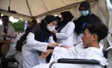 Petugas Penyelenggara Ibadah Haji (PPIH) Arab Saudi memeriksa kondisi kesehatan jemaah haji dalam gladi posko layanan operasional Arafah, Muzdalifah, Mina (Armuzna) haji 1445H/ 2023 M di Asrama Haji Pondok Gede, Jakarta, Selasa (26/3/2023). Gladi posko yang diikuti 1.120 petugas PPIH Arab Saudi tersebut untuk memantapkan kesiapan saat puncak pelaksanaan haji 2024 di Arab Saudi. (FOTO : ANTARA FOTO/Sigid Kurniawan)