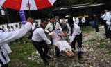 REPUBLIKA.CO.ID, JAKARTA -- Petugas penyelenggara ibadah haji (PPIH) Arab Saudi menggotong jamaah haji yang berkursi roda dalam gladi posko layanan operasional Arafah, Muzdalifah, Mina (Armuzna) haji 1445 H/2023 M di Asrama Haji Pondok Gede, Jakarta, Selasa (26/3/2023).