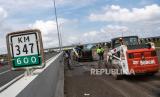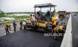 Pekerja dibantu alat berat menyelesaikan pengaspalan Jalan Tol Trans Sumatera ruas Kayu Agung-Palembang (Kapal) di Jejawi, Ogan Komering Ilir (OKI), Sumatera Selatan, Senin (27/3/2023). Untuk memperlancar arus mudik 2024 serta meningkatkan kenyamanan pemudik, PT Waskita Sriwijaya Tol melakukan perbaikan di Jalan Tol Trans Sumatera ruas Kayu Agung-Palembang (Kapal) dengan metode Scrapping Filling Overlay, Leveling, Patching dan ditargerkan selesai pada H-7 Idul Fitri 1445 H. (FOTO : ANTARA FOTO/Nova Wahyudi)