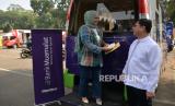 Direktur Utama Bank Muamalat Indra Falatehan (kanan) menyapa warga yang menukarkan uang pecahan baru di gerai bank Muamalat pada Layanan Kas Keliling Terpadu di Istora Senayan, Jakarta, Kamis (28/3/2024). Bank Muamalat menyiapkan uang tunai senilai Rp736 miliar untuk melayani kebutuhan transaksi selama Ramadan dan Idulfitri tahun ini. Uang tersebut disiapkan untuk penukaran uang baru dan penarikan tunai di ATM dan kantor cabang. Persiapan ini dalam rangka mendukung program Bank Indonesia untuk memastikan kesiapan uang tunai layak edar selama Ramadan dan Idulfitri 1445 Hijriah, sekaligus wujud kontribusi Bank Muamalat dalam melayani umat. (FOTO : Dok Republika)