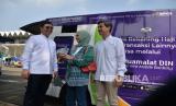 Direktur Utama Bank Muamalat Indra Falatehan (kiri) bersama Sekretaris Perusahaan Bank Muamalat Hayunaji (kanan) menyapa warga yang menukarkan uang pecahan baru di gerai bank Muamalat pada Layanan Kas Keliling Terpadu di Istora Senayan, Jakarta, Kamis (28/3/2024). Bank Muamalat menyiapkan uang tunai senilai Rp736 miliar untuk melayani kebutuhan transaksi selama Ramadan dan Idulfitri tahun ini. Uang tersebut disiapkan untuk penukaran uang baru dan penarikan tunai di ATM dan kantor cabang. Persiapan ini dalam rangka mendukung program Bank Indonesia untuk memastikan kesiapan uang tunai layak edar selama Ramadan dan Idulfitri 1445 Hijriah, sekaligus wujud kontribusi Bank Muamalat dalam melayani umat. (FOTO : Dok Republika)