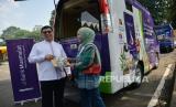 REPUBLIKA.CO.ID, JAKARTA -- Direktur Utama Bank Muamalat Indra Falatehan bersama Sekretaris Perusahaan Bank Muamalat Hayunaji menyapa warga yang menukarkan uang pecahan baru di gerai bank Muamalat pada Layanan Kas Keliling Terpadu di Istora Senayan, Jakarta, Kamis (28/3/2024).