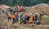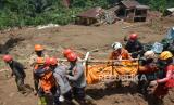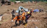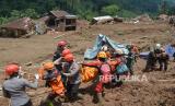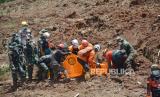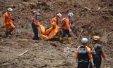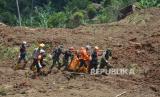 Petugas membawa jenazah korban longsor yang berhasil ditemukan di lokasi longsor di Kampung Gintung Desa Cibenda, Kecamatan Cipongkor, Kabupaten Bandung Barat, Kamis (28/3/2024). Dari 10 korban longsor, 7 telah ditemukan tertimbun material longsor. Hingga saat ini proses pencarian korban masih terus dilakukan oleh petugas gabungan. (FOTO : Edi Yusuf/Republika)