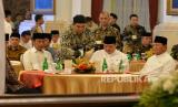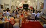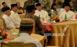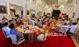 Presiden Joko Widodo menggelar buka puasa bersama para menteri Kabinet Indonesia Maju di Istana Negara, Jakarta, Kamis, (28/3/2024). Sejumlah menteri dan pejabat tinggi negara tampak hadir pada acara buka puasa tersebut, termasuk Presiden terpilih 2024-2029, Prabowo Subianto yang duduk satu meja bersama Presiden Joko Widodo. Pada acara itu Wakil Presiden Maruf Amin memberikan ceramah sebelum berbuka puasa. Acara ditutup dengan tausiyah dan doa dari penceramah Gus Mifthah. (FOTO : Republika/Edwin Dwi Putranto)