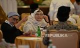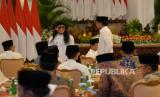 Menteri Luar Negeri Retno Marsudi dan Menkeu Sri Mulyani menghadiri acara buka puasa bersama para menteri Kabinet Indonesia Maju di Istana Negara, Jakarta, Kamis, (28/3/2024). Sejumlah menteri dan pejabat tinggi negara tampak hadir pada acara buka puasa tersebut, termasuk Presiden terpilih 2024-2029, Prabowo Subianto yang duduk satu meja bersama Presiden Joko Widodo. Pada acara itu Wakil Presiden Maruf Amin memberikan ceramah sebelum berbuka puasa. Acara ditutup dengan tausiyah dan doa dari penceramah Gus Miftah. (FOTO : Republika/Edwin Dwi Putranto)