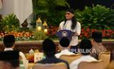 Penceramah Gus Miftah memberikan tausiyah saat buka puasa bersama para menteri Kabinet Indonesia Maju di Istana Negara, Jakarta, Kamis, (28/3/2024). Sejumlah menteri dan pejabat tinggi negara tampak hadir pada acara buka puasa tersebut, termasuk Presiden terpilih 2024-2029, Prabowo Subianto yang duduk satu meja bersama Presiden Joko Widodo. Pada acara itu Wakil Presiden Maruf Amin memberikan ceramah sebelum berbuka puasa. Acara ditutup dengan tausiyah dan doa dari penceramah Gus Miftah. (FOTO : Republika/Edwin Dwi Putranto)