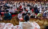 Sejumlah anak yatim menerima makanan saat acara buka puasa bersama di Jakarta, Kamis (28/3/2024). PT Adaro Energy Indonesia menggelar buka puasa bersama ribuan anak yatim dari 14 panti asuhan di Jabodetabek. Acara yang rutin setiap tahunnya dilakukan dan merupakan yang ke-12 kalinya ini bertemakan Segarkan Hati dengan Berbagi. (FOTO : Republika/Putra M. Akbar)
