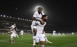Samuel Chukwueze dari AC Milan menaiki Ruben Loftus-Cheek dari AC Milan untuk merayakan setelah Loftus-Cheek mencetak gol 0-1 untuk tim mereka selama pertandingan sepak bola Serie A antara Fiorentina dan AC Milan di Stadion Artemio Franchi di Florence, Italia, Ahad (31/3/2024) dini hari WIB. (FOTO : Massimo Paolone/LaPresse via AP)