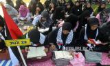 Sejumlah peserta membaca Al Quran saat Bogor Ngaos (Ngaji) Al Quran di Alun-alun Kota Bogor, Jawa Barat, Ahad (31/3/2024). Bogor Ngaos Al Quran jilid ke-4 yang diikuti sekitar seribu peserta dari kota dan Kabupaten Bogor tersebut dalam rangka dakwah dan syiar membaca Al Quran di bulan Ramadhan sekaligus doa bersama dan penggalangan dana untuk rakyat Palestina.  (FOTO : ANTARA FOTO/Arif Firmansyah)