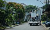 Warga berjalan keluar dari cluster tempat tinggalnya di cluster Visalia, Perumahan Kota Wisata, Ciangsana, Gunung Putri, Kabupaten Bogor, Jawa Barat, Ahad (31/3/2024). Jihandak Zeni TNI AD berhasil mengamankan lima material peledak yang diduga granat yang terpental ke cluster Visalia saat terjadi kebakaran di gudang amunisi daerah (Gudmurah) Kodam Jaya. Hingga saat ini pukul 13.00 WIB, tim Jihandak masih melakukan penyisiran dengan menggunakan mobil bahan peledak, metal detector dan peredam ledakan untuk meminimalisir serpihan sisa bahan peledak di kawasan tersebut. Sampai saat ini, warga di cluster Visalia masih diminta untuk mengosongkan rumah sampai penyesirian Jihandak selesai dilaksanakan. (FOTO : Republika/Thoudy Badai)