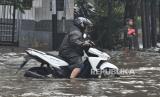 Pengendara sepeda motor mendorong motornya yang mogok saat melintasi genangan air di Jalan Sultan Agung, Bekasi, Jawa Barat, Senin (1/4/2024). Sistem drainase yang buruk di kawasan tersebut menyebabkan genangan air dengan ketinggian 10 cm -30 cm usai hujan sehingga menimbulkan kemacetan lalu lintas. (FOTO : ANTARA FOTO/ Fakhri Hermansyah)